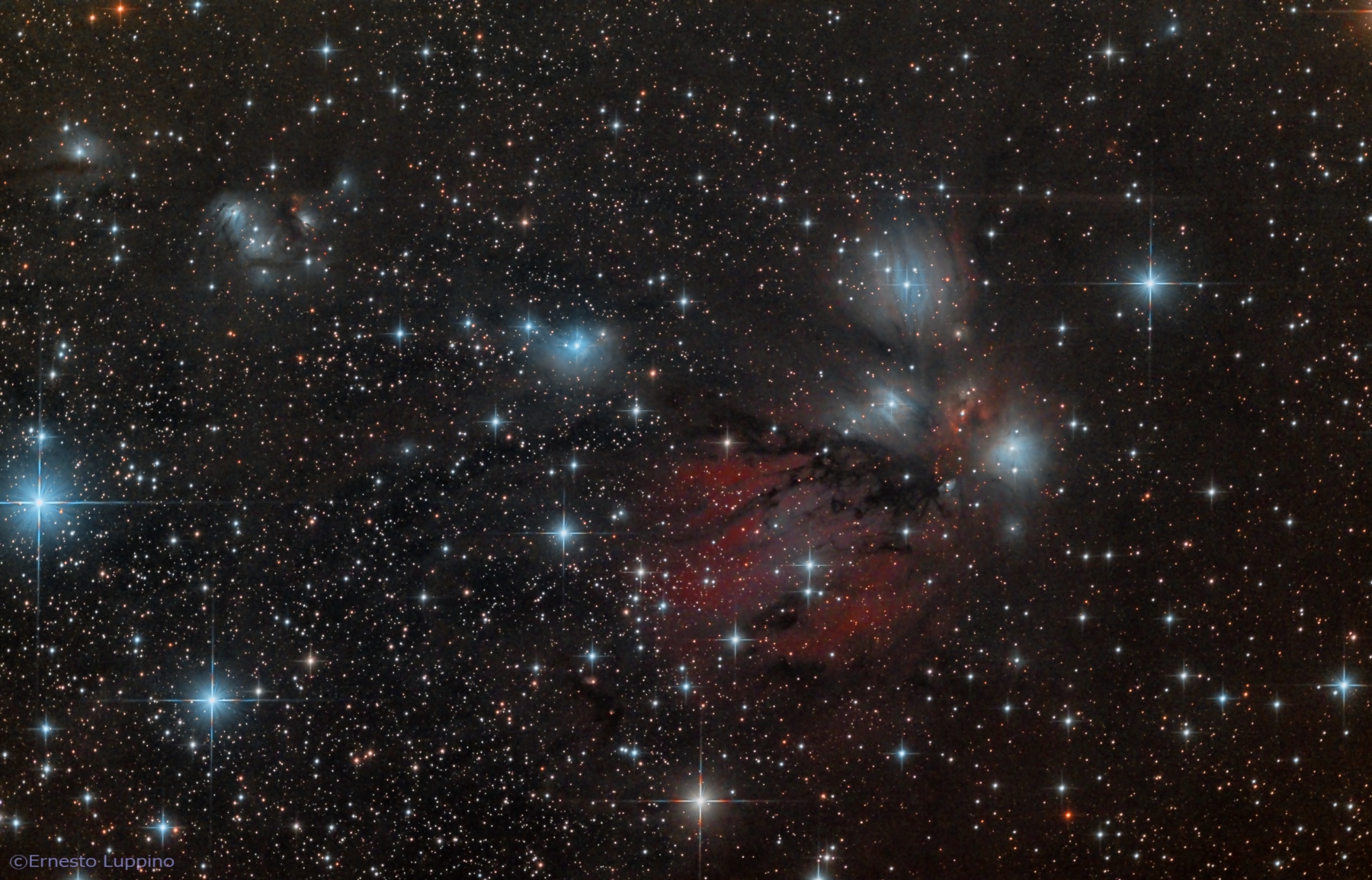 In the image there are some reflection nebulae: NGC2170, NGC 2182, NGC 2183, NGC 2185, Ced 65, Ced 66, Ced 71, some emission nebulae (such as LBN 999), while the presence of some dark nebulae is appreciated because they are obstructing the vision of far objects.